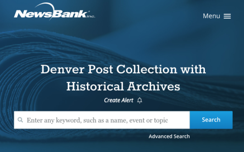 The Library is pleased to offer the online Denver Post Historical Archive. When complete (soon!) the paper will be searchable from the year of its inception, 1894, through 1989. Meanwhile, any missing years can be accessed on microfilm in the Auraria Library. More recent articles are available through America’s News and the Denver Post website.